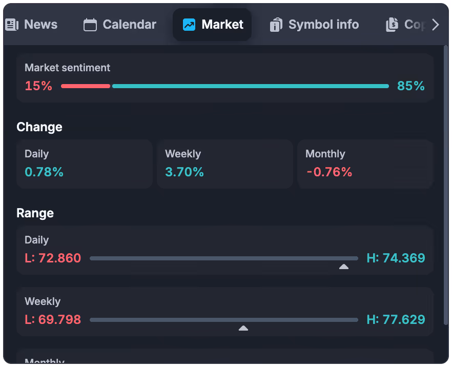See where the crowd is positioned in real time. Our market sentiment tool shows the percentage of traders long vs short on each instrument, giving you an additional data point to refine your entries and exits.